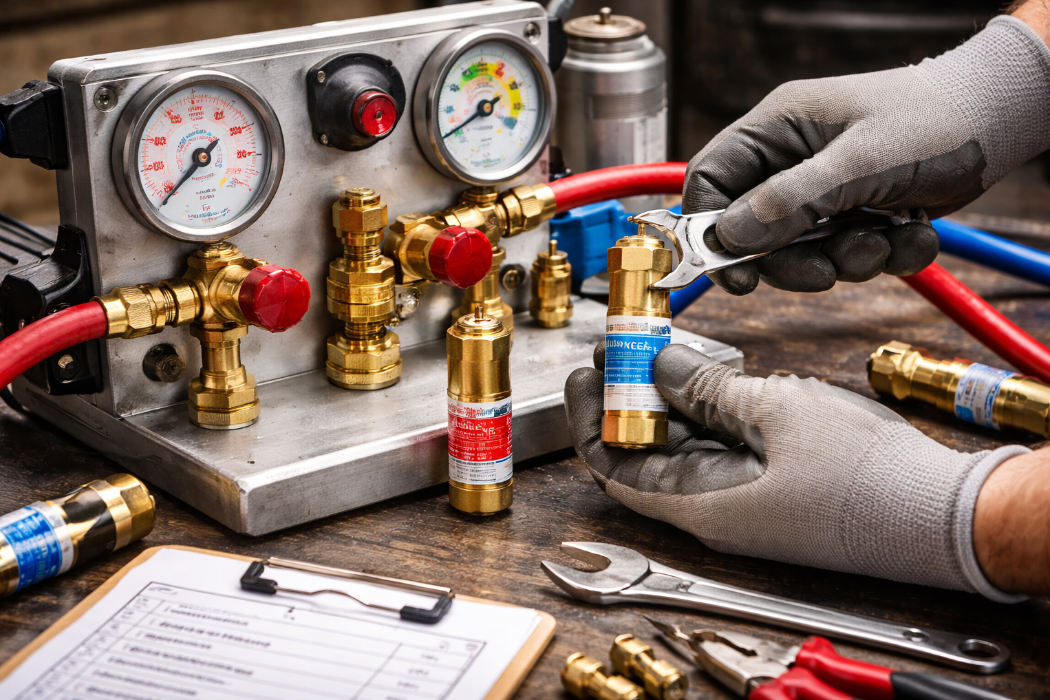 Druckregler, Leitungsdruckregler, Propan-, Butan-, Acetylen und Sauerstoffregler sowie Rückschlagsicherungen und Flaschenrückschlagventile prüfen und setzen wir instand.